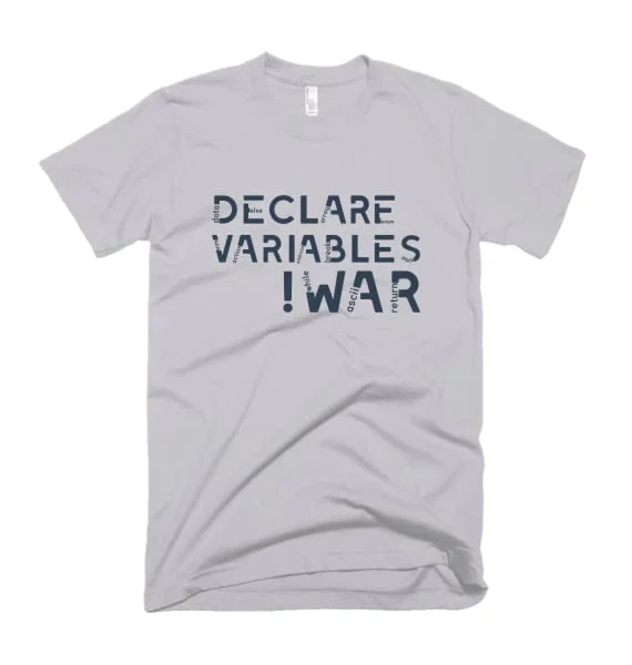 For the programmers who believe in clean syntax and cleaner worldviews, this tee is a clever fusion of logic and philosophy. Featuring the smart slogan “DECLARE VARIABLES !WAR”, it’s a nod to both programming practices and pacifist principles—because we’d rather resolve bugs than start battles.
