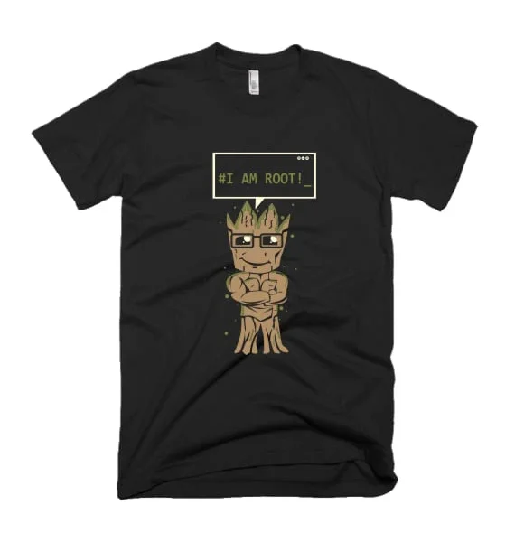 This shirt blends two worlds: the command-line power of a root user and the charm of a certain tree-like superhero. Wearing it says you’re in control — of systems and style.