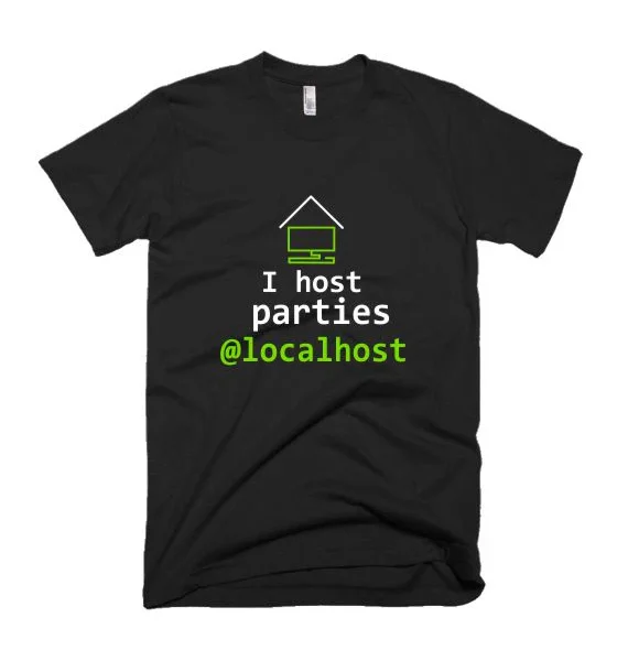 The design features a quirky house-and-monitor icon above the phrase “I host parties @localhost” in a classic developer font.