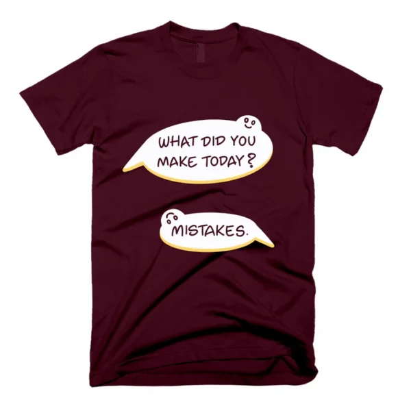 Features a playful speech bubble conversation between two cute ghost-like characters — one asking “What did you make today?” and the other proudly replying “Mistakes.”