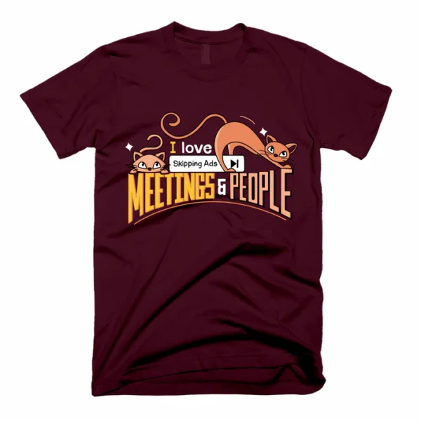 Printed on a rich Maroon T-shirt, the design features expressive orange cats leaping over bold typography. The words “I love Skipping Ads” are followed by a clever twist: “Meetings & People” in cinematic font — with a YouTube-style skip button for added wit.