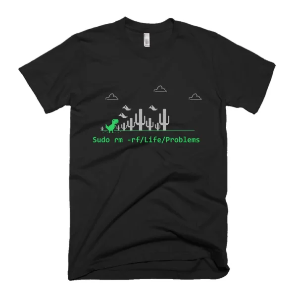 Set on a clean Black background, the design features a retro pixel-style landscape with a green dino running through a code-desert filled with cacti. The line of code reads:Sudo rm -rf /Life/Problems