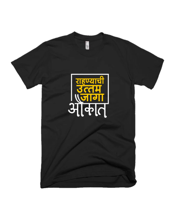 Bold Marathi quote: “राहण्याची उत्तम जागा – औकात” printed in dual-tone (white + mustard yellow)