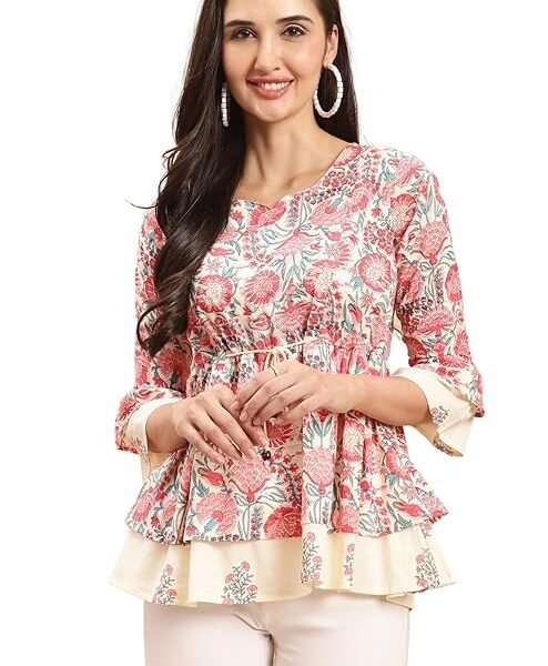 Rajnandini Women’s Pure Cotton Jaipuri Printed Short Western Top (JOPLJPR711_Cream)