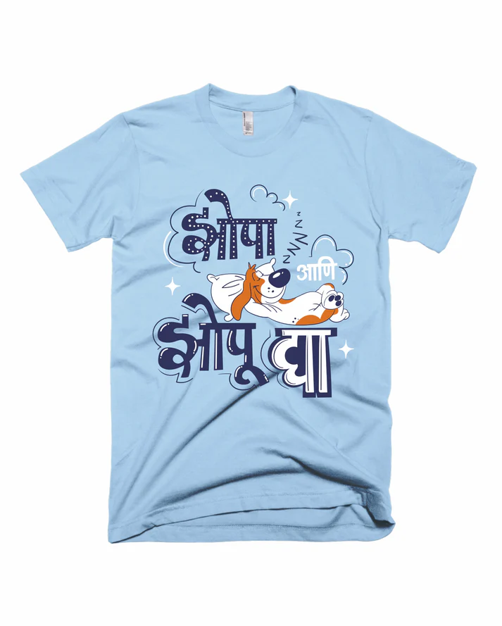 Print: Two snoozing dogs with fluffy cloud bubbles and Marathi text that says it all