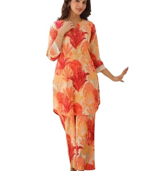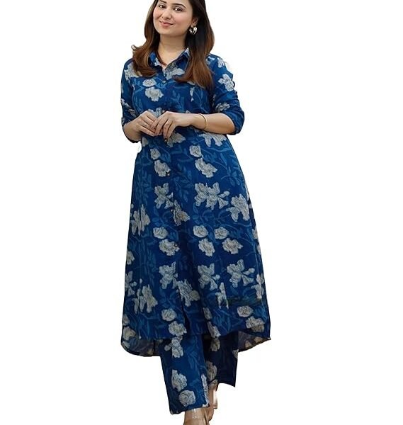 Arayna Women’s Cotton Floral Printed Co-ord Set – Straight Kurta Palazzo Pants, Blue