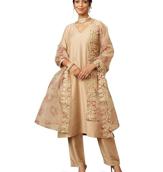 Amazon Brand – Myx Women’s Solid Regular Embroidered Kurta Pant Set with Organza Dupatta
